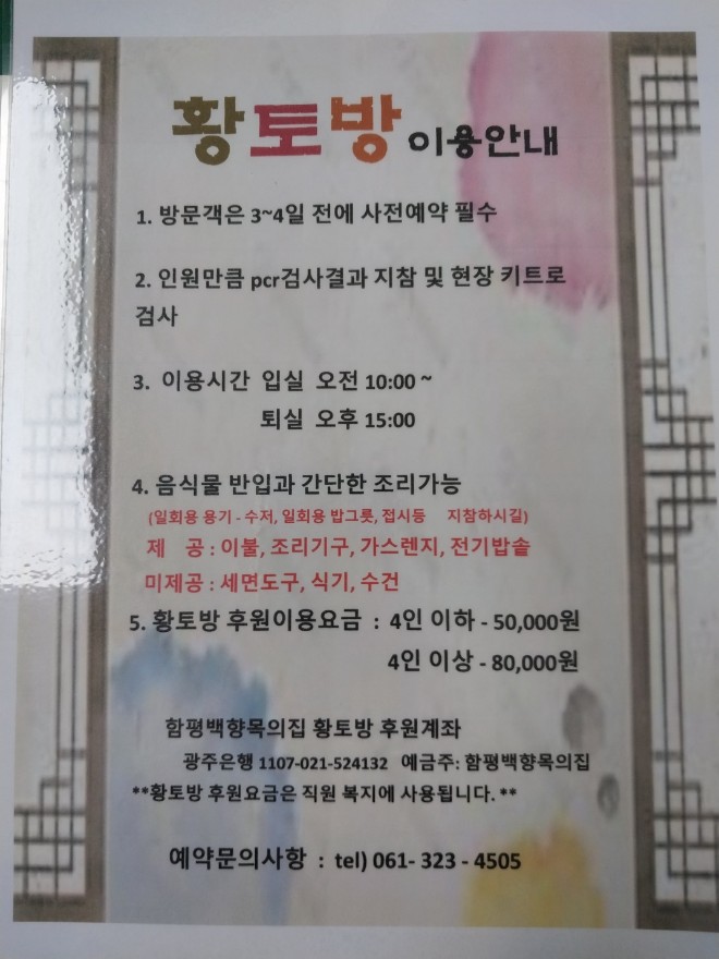 안녕하세요 함평 백향목에 황토방이 새롭게 오픈하였습니다~* 기존에 면회실이 따로 있었지만 멀리서 방문하시는 보호자 분과 어르신과의 만남을 좀더 여유롭고 편안한 분위기에서 모실수 있도록 야심차게 준비했습니다 33평 건부지에 독채로 3룸, 화장실, 주방 이용시간 입실 오전 10am 퇴실 익일 오후 15:00pm 음식물 반입과 간단한 조리 가능 제공 : 이불,조리기구,가스렌지,전기밥솥 미제고 : 세면도구,식기,수건 황토방 이용요금 : 4인 이하 50,000원 / 4인 이상 80,000원 함평백향목의집 황토방 후원계좌 광주 은행: 1107-021-524132 예금주: 함평백향목의집 **황토방 후원요금은 직원 복지에 사용됩니다 예약문의사항 : 061-323-4505 |